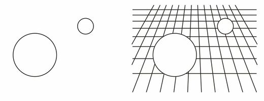 大きな丸と小さな丸がある。ほとんどの人は「大きな丸と小さな丸があるな」とバカ正直に見る。これに補助線をつけたすと「遠くにある丸と近くにある丸」に変わる。ところがバカの見方では「大きい丸と小さい丸があって、その後ろに補助線が引いてあるだけ」とバカ正直に考え続けるのだ。