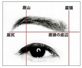 「正しい位置」は3カ所あります。眉頭の先端は、目頭の先端と鼻筋の間の窪みの真上にあること。眉山は、目をあけたときの目尻の真上。眉尻の長さは、眉頭の底辺と高さをそろえます。