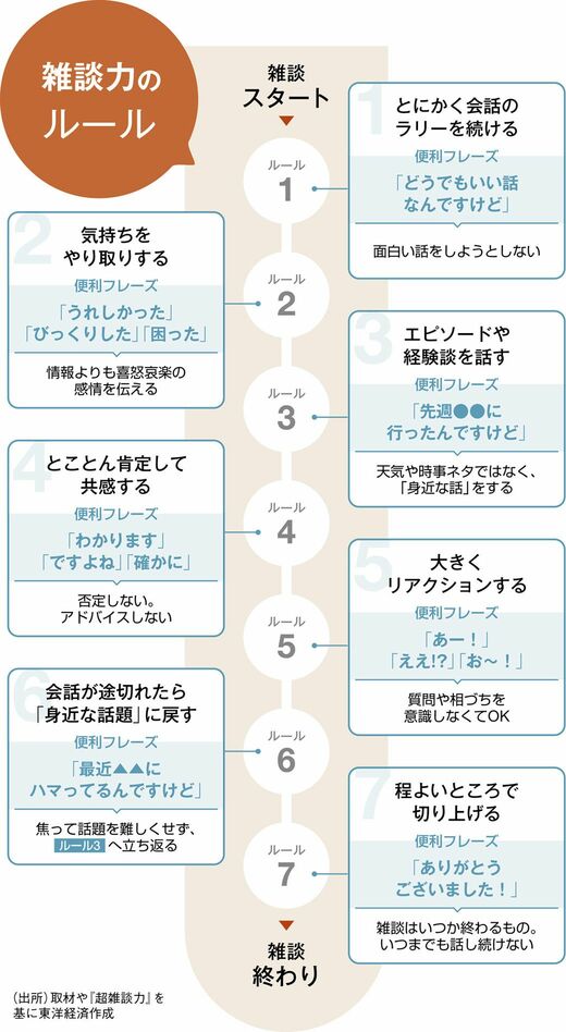 6つ目は「会話が途切れたときには身近な話題に戻す」。話題が尽きたときは、3つ目として挙げた、エピソードや経験談に戻るようにする。政治経済の動向では間が持たない。詳しいこともよく知らずにトランプ関税ネタで時間を稼ぐのは難しい。天気図や桜の開花情報も、興味がなければ長く話せるわけがない。そんなときは、いつでも話せる話題が最適だ。経験談なら、手を替え品を替え話すことができる。「原点に返る」のが大事だ。
