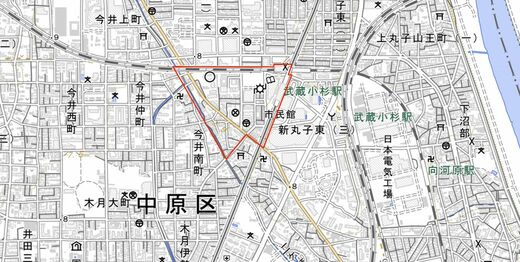 小杉町3丁目は、JR南武線と東急東横線の線路と、川崎堀と呼ばれる小川に囲まれた地域だ。ここにも屋上に「R」マークをのっけたタワマンが4棟建っている。