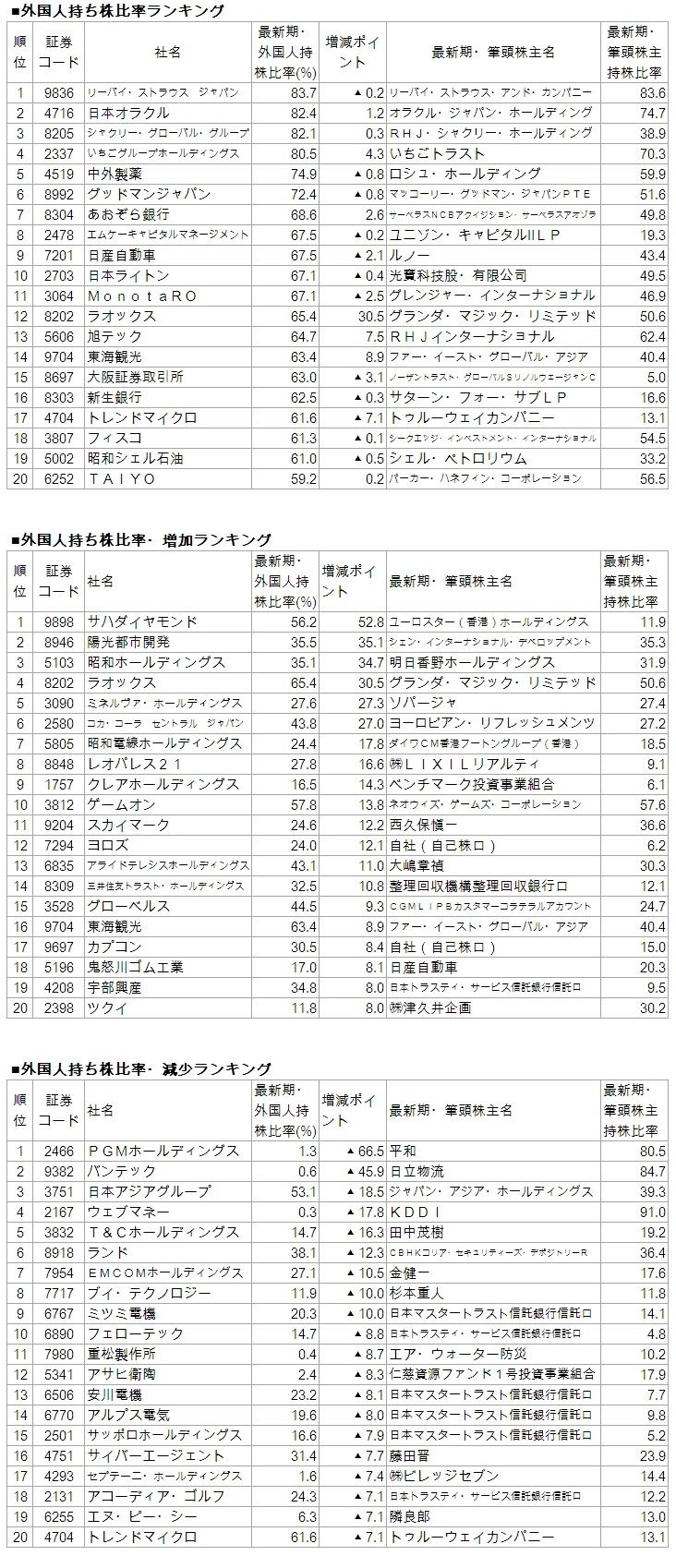東洋経済では、日本国内の上場会社に対し、年2回(本決算および第2四半期決算時)大株主の動向調査を行っている。今回は、(1)最新時点での外国人持ち株比率が高い会社、(2)半期前(半年前の本決算・第2四半期決算)と比べて外国人持ち株比率が増加した会社、(3)外国人持ち株比率が減少した会社を上位20位までランキングした。なお、新規上場会社や上場廃止の会社など、最新期と半期前との比較ができない会社は除いている。