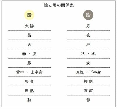 上の表のように、活動的で明るく温かい性質のものが陽で、暗く冷たい性質のものを陰とします。