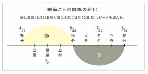 また、1日のうちで陽が極まるのが真昼で、そこから次第に陽が弱まって陰が徐々に増し、真夜中には陰が極まり、夜明けに近づくにつれて陰が弱くなっていきます。1年では陽が極まるのが夏至、陰が極まるのが冬至です。