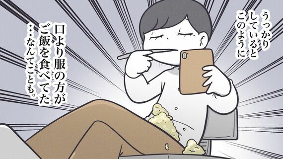 食事中の「ながらスマホ」もコレで上品に? ズボラさんが試したい「食べこぼし」を防ぐ2つの秘技 漫画「丁寧ならぬ暮らし」(第54話)