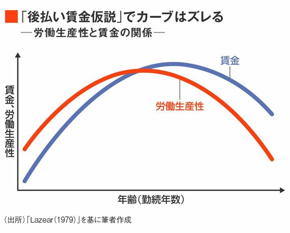 ただし、企業は若年期に労働生産性を下回る賃金を支払い、高齢期に労働生産性を上回る賃金を支払うという「後払い賃金仮説」により、賃金カーブの傾きは労働生産性のカーブよりも傾きが急で、労働生産性は賃金よりも早いタイミングでピークを迎えるとされている。