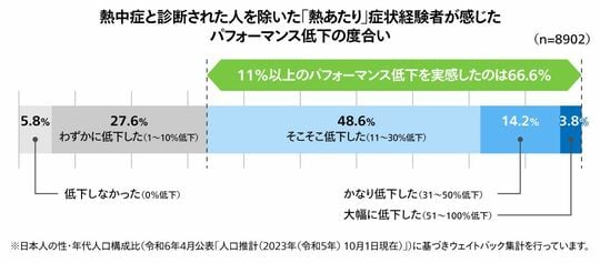 「熱あたり」は直ちに病気とはいえないものの、全世代が意識すべき状況であるということが明らかになった。加えて見逃せないのが、「暑さによる不調によってあなたの日常のパフォーマンスはどのくらい低下したと感じますか?」との設問に対し、「低下しなかった」がわずか5.8%という結果だ※3。谷口医師は、「3つ目は、『熱あたり』が体の不調にとどまらず、日常のさまざまな場面でのパフォーマンス低下にもつながっていることです」と続ける。