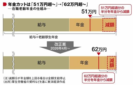 高齢者の労働意欲をそぐといわれる在職老齢年金の「壁」にも見直しが入った。在職老齢年金とは、60歳以上の人が働きながら年金を受け取る制度。ただし、月の給与と厚生年金給付額の合計が51万円(2025年度)を超えると、年金の一部が支給停止(減額)される(基礎年金は対象外)。