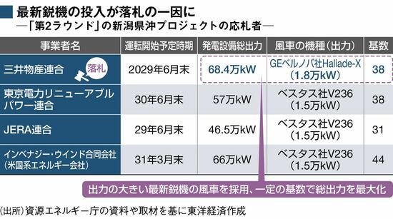 こうした条件の下で売電収入の最大化を図る手段が、単機出力の高い大型風車の採用だった。1基当たりの発電出力が大きければ、設置基数を少なくでき、工事費用も削減できる。この洋上風力業界の定石にのっとって、三井物産連合以外の3事業者は、デンマークのベスタス社が21年に市場に投入した新型機(出力1万5000キロワット)を採用する計画とした。