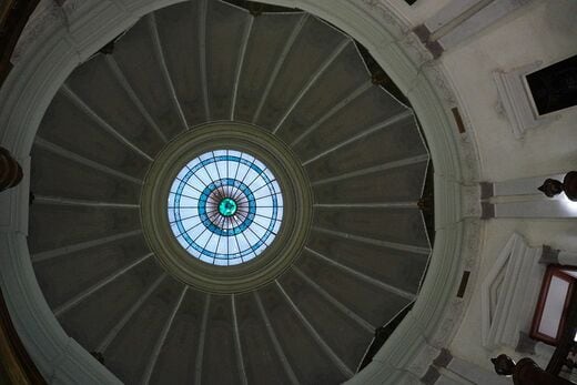 エントランスを支えている力強さのある円柱が印象的な本館。まるでギリシャ神殿のような姿形だ。外観はルネッサンス様式、室内はバロック様式を基本としてつくり上げられた。一歩足を踏み入れると正面に大階段がそびえる。ふと見上げればドーム状の天井にはステンドグラスがあてがわれ、日が差し込む。