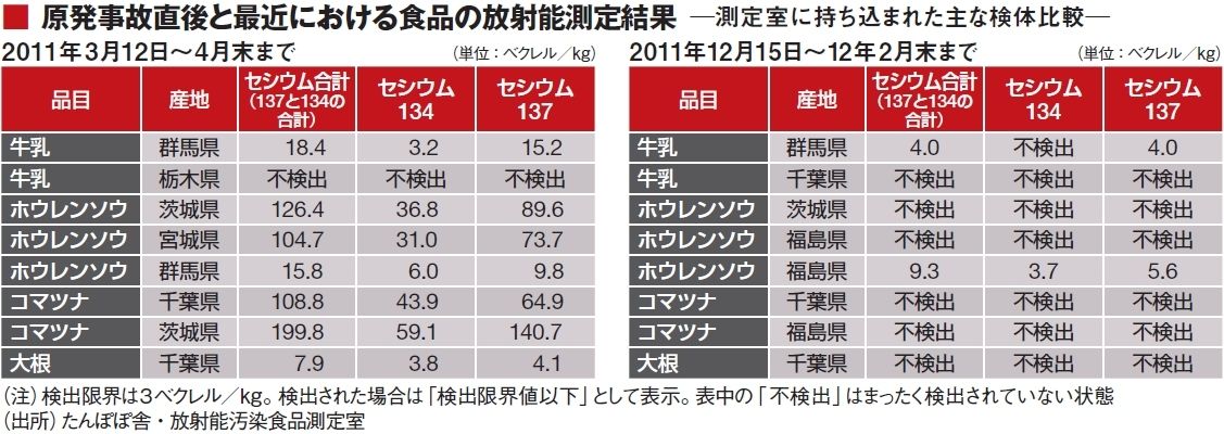 とはいえ、牛乳で放射能が検出され続けていることも事実だ。本誌は食品の放射能測定で20年以上の実績を持つたんぽぽ舎・放射能汚染食品測定室に市販の牛乳12本の測定を依頼。12本中2本の牛乳から6ベクレル/キログラムおよび2ベクレル/キログラムのセシウムが検出された。
