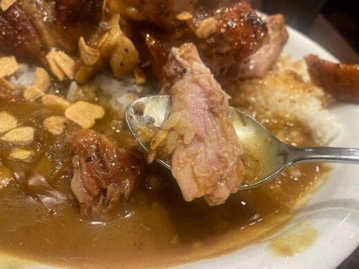 しかし、スプーンを入れるとほろっと肉がくずれて、カレーのルーにとけていく。