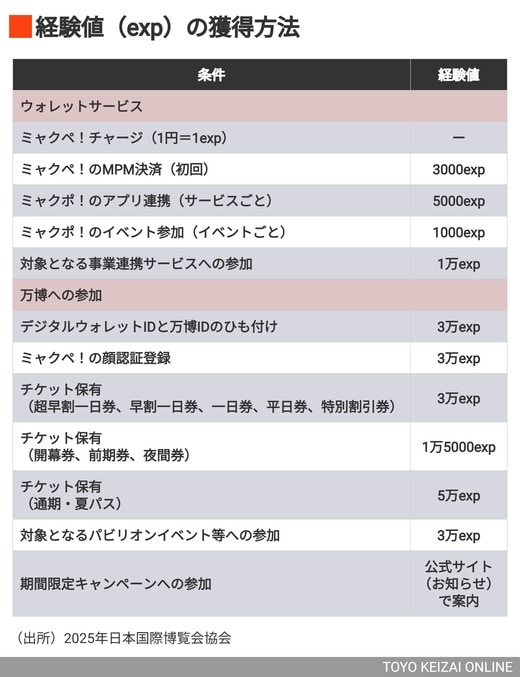 経験値は、決済サービスの「ミャクペ!」のチャージや決済、万博や関連イベントへの参加などで獲得できる。万博を訪れる人なら、チケット購入や来場日時予約などのために万博IDを取得するが、この万博IDとデジタルウォレットIDを連携することで3万exp、チケット情報の連携で1万5000~5万expの経験値が得られる。