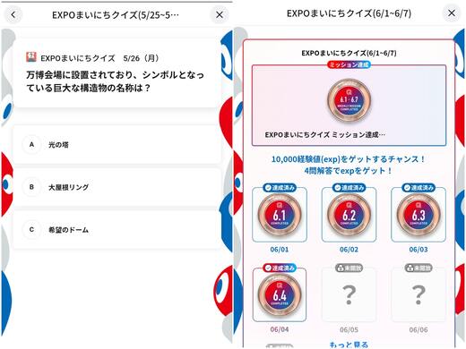 この経験値の獲得方法に5月18日から「EXPOまいにちクイズ」が追加された。大阪・関西万博やEXPO2025デジタルウォレットに関する簡単なクイズが毎日1問出題され、正解するとスタンプ(SBT)がもらえる。このスタンプを週4個以上獲得すると、ミッション達成で経験値1万expが獲得できるのだ。