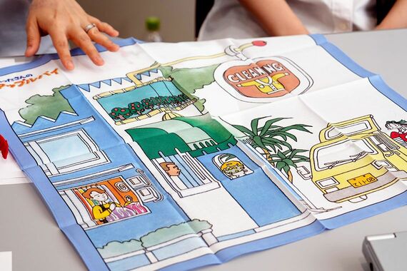 また寺村輝夫・永井郁子による読み物『わかったさんのおかしシリーズ』(あかね書房)のハンカチにも、各巻の冒頭に必ず登場する「クリーニング屋さん」の場面を表現。本題に入る前の何げないシーンだが、物語の入り口であり、「読者の記憶とつながる場所」であることから商品化した。また、絵本で使われているのと類似した色彩のみを採用することで、原作の雰囲気が伝わるよう工夫した。