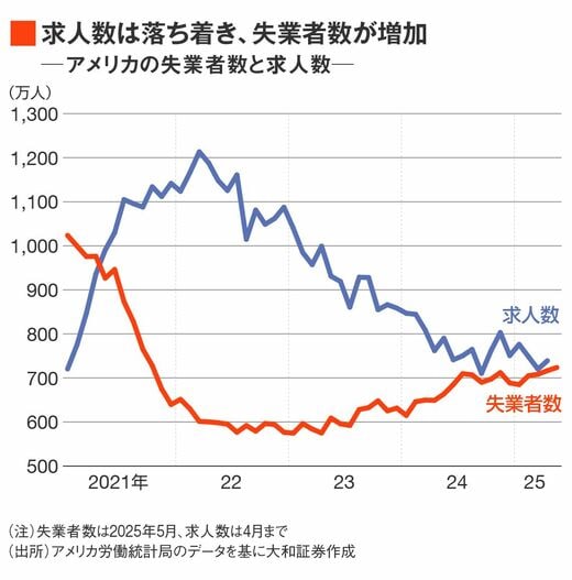 ただ、労働市場が今後も堅調さを維持するかどうかの確認作業は続くだろう。下図は、アメリカの求人数と失業者数の推移を示している。