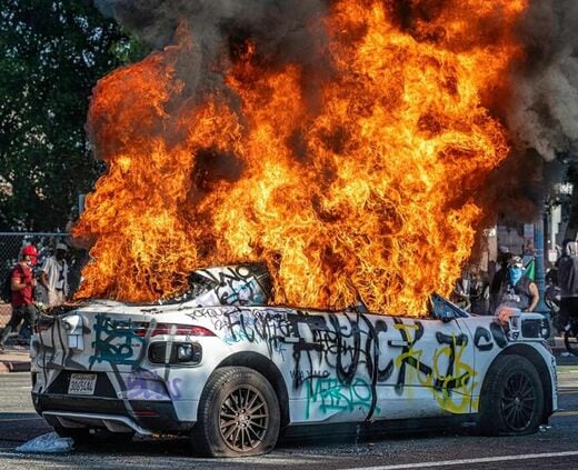 戦場での取材経験があるフォトグラファー、マーク・エドワード・ハリス氏は8日、オレンジの炎に包まれる乗用車の写真をインスタグラムにアップした。車体には「ICE、クソでもくらえ」とスプレーで書いてある。