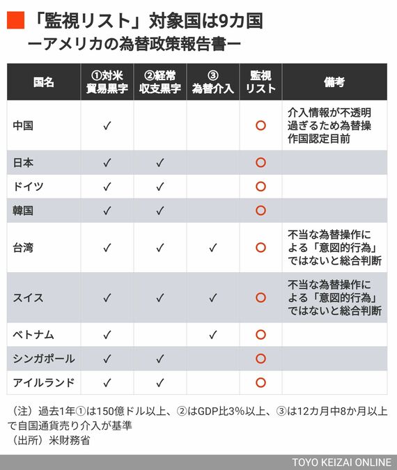 為替政策報告書は本来、その分析を通じて「為替操作国」に認定された場合、二国間交渉を経て通貨政策や貿易慣行の見直しを迫られたり、そこで合意に達することができなければ関税が引き上げられたり、輸出入の制限措置が取られたりすることが想定されるものだ。