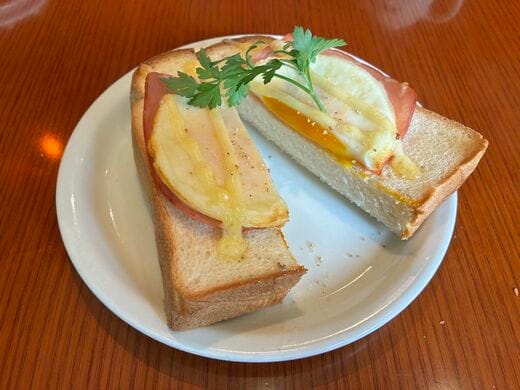 続いて手を伸ばしたのはハムエッグ・トースト。イギリス山食パンの上に、ハムと半熟目玉焼き、マヨネーズがとろ~り。パンはザクザクと硬めの食感で、最初は「硬っ!」とビックリ。 ところが噛んでるうちに、じわ〜っと小麦の旨味が口の中に広がって、「これ、クセになるやつやん」と思わず呟いていた。
