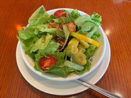 お次はサラダの出番だ。野菜は日替わりだそうで、この日は、レタス、アボカド、ミニトマト、パプリカが色鮮やかに。シャキシャキのレタスのみずみずしさをベースに、アボカドのクリーミーさやトマト、パプリカの酸味が生き生きと感じられた。