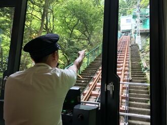 シャッターチャンスの少し前から録画してくれるのも大きな魅力です。次の画像は、神奈川県の大山観光電鉄(大山ケーブルカー)の新型車両内覧会で撮影したもの。10月1日にデビューした新型車両で、乗務員が阿夫利神社駅のホームを指差し確認しているところを捉えました。