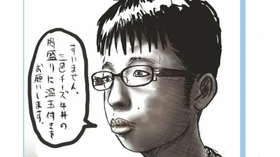 20年近く前にブログに投稿されたイラストで、メガネをかけたおとなしそうな若い男性と「すいません。三色チーズ牛丼の特盛りに温玉付きをお願いします」というセリフが描かれている。その後、巨大掲示板で使われるようになり、「チー牛」として広がっていった。
