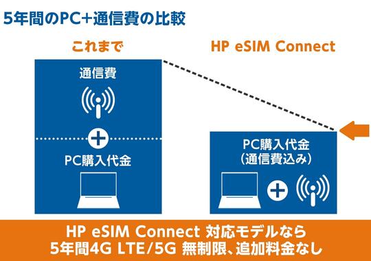 しかも追加コストは不要であり、HPの試算によればHP eSIM Connectを利用した場合と通常のデータ通信無制限プランで運用した場合の比較では、同一PCを5年間運用した通信コストはおよそ4分の1(参考価格)程度に抑えられる。インフラコスト削減を意識している経営者であれば、真っ先に検討すべきソリューションであろう。