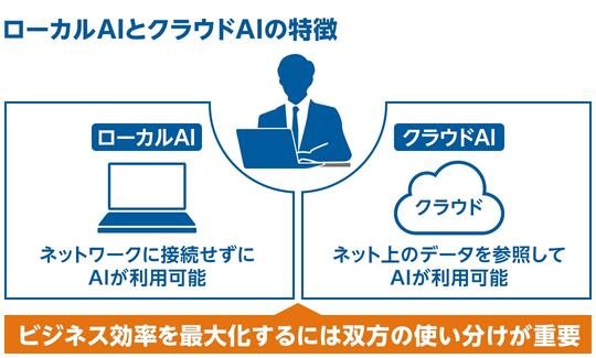 AI PCはPC本体にAI処理に適したエンジンが搭載され、PC単体(=ローカル)で効率よくAI機能を活用できる。一方でこれまで主流だったクラウド経由のAI処理には、ネット上の膨大なデータを参照できるという大きなメリットがある。つまり、ローカルAIが既存情報の整理を得意分野とするなら、クラウドAIは常に変動する最新の情報を用いた推論や創造性の高い作業が得意分野に該当する。AI活用を加速させ、ビジネス生産性を向上させるには、クラウドとローカルの双方を上手に使い分けることが肝要なのだ。