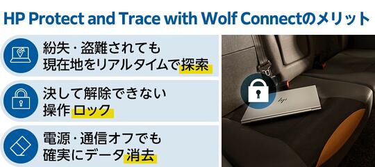 そんなリスクに有効なのが「HP Protect and Trace with Wolf Connect」*2というソリューション。PCがオフラインでも電源が入っていない状態でも、PCの現在地をリアルタイムで探索し、必要に応じてリモートでPCをロックしたり、NIST(米国国立標準技術研究所)が定めるレベルでデータ消去を実行するという機能だ。モバイルにおけるデバイス管理の信頼性を飛躍的に高め、万が一の際のコンプライアンスリスクにも対応できる。また、海外80か国以上にも対応しているため海外出張時などの盗難リスクにも対応が可能なのも大きな特長だ。(対応国情報はこちら)