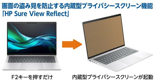 こうしたリスクに対してHPは「HP Sure View Reflect」*1というソリューションを用意している。キーをワンタッチするだけで、内蔵型プライバシースクリーンが動作してPC画面が暗くなり、後方からの盗み見を防ぐというもの。外出先で、盗み見による情報漏えいを心配することなく仕事に取り組めれば、新幹線や飛行機などで移動中に仕事を続けざるを得ない経営層や幹部クラスの社員でも、安心できるはずだ。