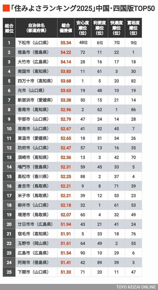 ライフ #住みよさランキング 前の記事 次の記事 「住みよさランキング2025」中国・四国版トップ50! 3位は広島県大竹市、2位は徳島県徳島市、では1位は? 3分で読める 公開日時:2025/06/23 05:00 東洋経済『都市データパック』編集部 フォロー 1/3 PAGES 2/3 PAGES 1~25位 次ページが続きます:【26~50位は?】 3/3 PAGES