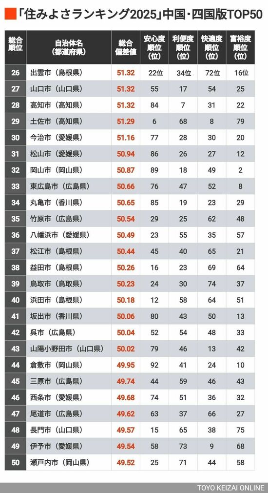 「住みよさランキング2025」中国・四国トップ50【この記事】