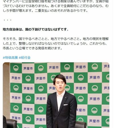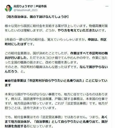 兵庫県芦屋市長の高島崚輔氏は「地方自治体は、国の下請けではないはずです」と問題提起した(画像:高島りょうすけ|芦屋市長Xより)