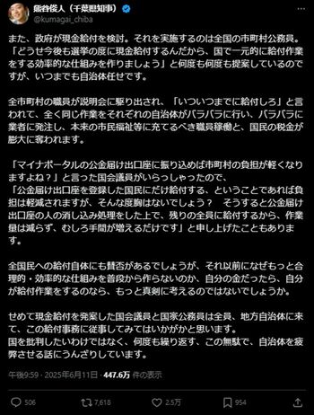 千葉県知事の熊谷俊人氏は「この給付事務に従事してみてはいかが」と問題提起した(画像:熊谷俊人(千葉県知事)Xより)