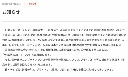 番組そのものは継続し、国分さんは降板を了承したとする一方、「国分氏のコンプライアンス上の問題行為の詳細については、プライバシー等の観点から配慮すべき点が多く、説明を控えさせていただきます」とした。