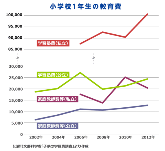 文部科学省の「子供の学習費調査」によれば、ここ数年、「家庭教師費等」(通信教育費を含む)や「学習塾費」が上昇傾向にある。この傾向は幼少期の子どもからすでに見ることができ、とくに公立学校よりも私立学校の子どものほうがこれらの費用が高く、教育熱心な家ほど、こうした「補助学習」に多くのリソースをあてていることが見て取れる。
