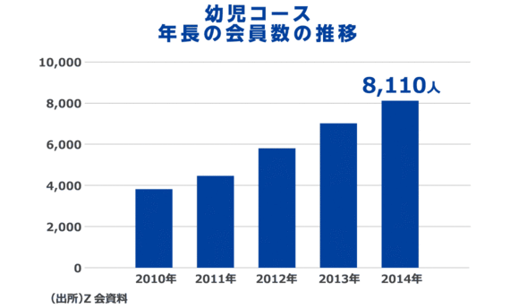 この幼児向けコースは保護者にも受け入れられ、実際、幼児年長コースの会員数は、スタートした2010年には3816人だったのに対し、4年後の2014年には8110人と倍増している。