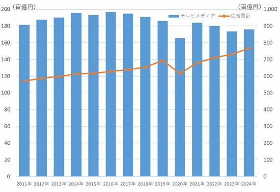 ただ、近年テレビメディアの広告費は微減を続けており、コロナ禍で大きく減少した。その後は復帰基調にあるが、中長期的には微減の傾向が見られている。