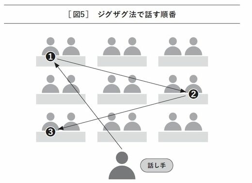最も重要なことはアイコンタクト、聴衆の目を見て話すということです。問題になるのは、大勢になったら誰を見ればよいか迷うことです。お勧めは、図5のような順で、1人ずつ話すやり方です。