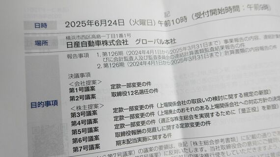 実際には、この株主提案が24日の株主総会で議案として扱われることはない。日産は、この提案を取締役選任議案の反対の意向表明として整理し、招集通知の取締役選任議案の注記として細かな文字で記述するにとどめているからだ。