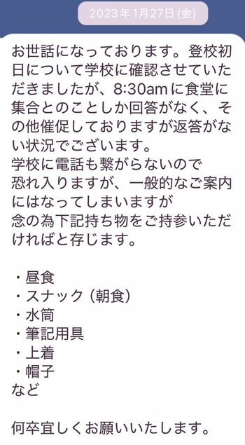 10日ほど前にオリエンテーションがあったものの、制服の購入やスクールバスの手配などの事務手続きがメインで、入学日についての案内はありませんでした。