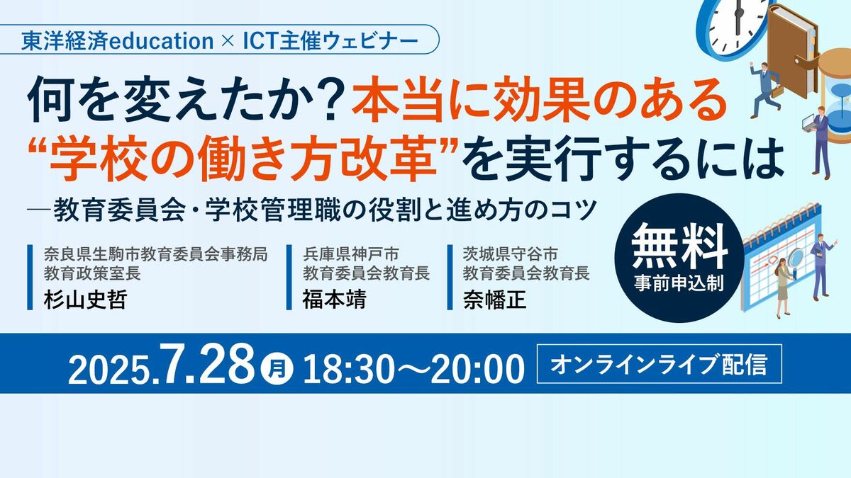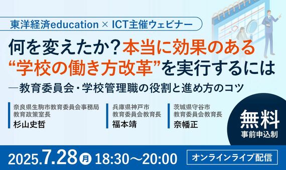 では、教育委員会や学校、そして管理職はどのように働き方改革に向き合っていけばよいのでしょうか。今回は、働き方改革において特徴的な取り組みで成果を挙げている奈良県生駒市、兵庫県神戸市、茨城県守谷市の教育委員会からスピーカーを迎え、「何を変えたか? 本当に効果のある“学校の働き方改革”を実行するには—教育委員会・学校管理職の役割と進め方のコツ」と題して、それぞれの取り組みについてお話しいただきます。