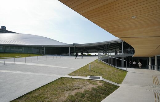 メインアリーナとサブアリーナ、そして武道施設などが1枚のうねる屋根によって結ばれた柔らかな印象の建築だ。緩やかな坂から各エントランスにたどり着けるアプローチなど、バリアフリーに対する配慮も感じさせる。