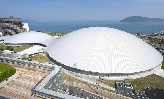 本物の瀬戸内海を望む港湾地区にできた県立のアリーナ施設「あなぶきアリーナ香川」だ。