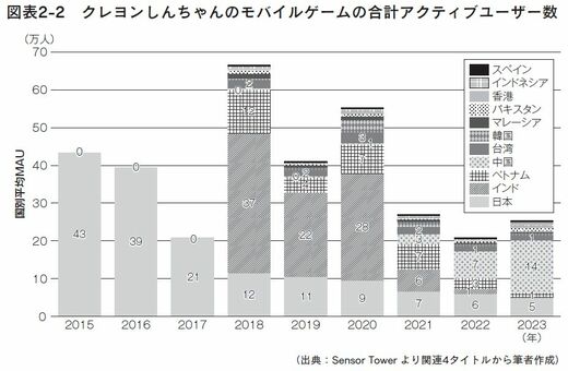 下の図表は、現在アップルやグーグルで配信されているクレヨンしんちゃん関連アプリの地域別のMAUの平均値を年ごとにまとめたものだ。2018年に海外向けアプリが展開されているため急激に数字が膨らんでいるが、基本的にはインドが5割、ベトナム・日本が2割ずつで、あとは中国・台湾・韓国・マレーシア以下全部あわせて1割といった具合である。