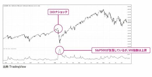 コロナショックでS&P500が急落している一方で、VIX指数は急上昇しています。このような状況では、株式相場が急落していると判断できます。VIX指数自体はアメリカ株の動きを表しています。日本株はアメリカ株の影響を受けやすいため、VIX指数も参考になりますが、必ず反映されるとはいえません。