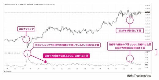 2020年のコロナショックで日経平均株価が大きく下落している一方で、日経VIは急上昇しています。そして、株価が反発上昇していくにつれて、日経VIも下落しています。2024年8月に日経平均株価が一時的に下落したときも日経VIが上昇し、日経平均株価の上昇とともに下落しています。