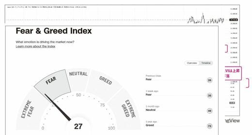 数値でも表されており、25未満で大きな恐怖、25〜50で恐怖、50〜55が中立、55〜75が楽観、75以上が強い楽観を示します。例えば、上の画像だと27を示しており、大きな恐怖を示す25に近づいているので、そろそろ買いを狙えるタイミングだと判断できます。