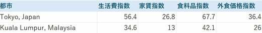 このデータを見る限りでは、同じ首都でも、クアラルンプールでの生活にかかるコストは東京のそれと比べて確かに「低い」と言うことができそうです。