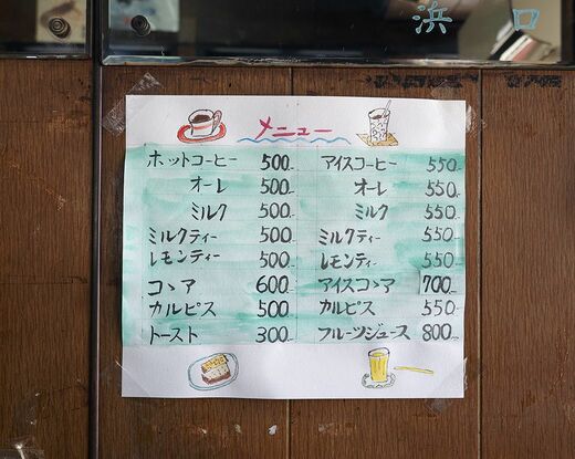 「喫茶思いつき」のメニューは全部で16種類。店内には晴江さん手作りのイラスト入りメニューが貼られている。昔は顧客の要望に応じて食事メニューを提供していたこともあったが、現在の食事メニューはトーストの一品のみ。