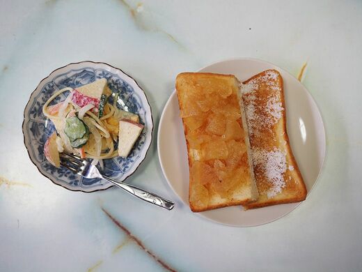 唯一の食事メニューであるトースト(300円)を注文。半分にはお手製のりんごジャム、もう半分には砂糖をまぶしている。白砂糖を霜のようにまぶした姿から、いつしか霜降りトーストと呼ばれるように。もともとは霜降りトーストだけだったが、お客さんに出したりんごジャムトーストが好評で半分ずつ提供するようになった。